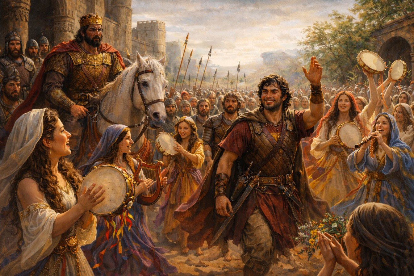 Sin embargo, Saúl no permaneció amistoso con David por mucho tiempo. Cuando Saúl y David regresaron de la batalla contra los filisteos, “las mujeres de todas las ciudades de Israel salieron cantando y danzando, para recibir al rey Saúl, con panderos, con cánticos de alegría y con instrumentos de música.” 1 Samuel 18:6.